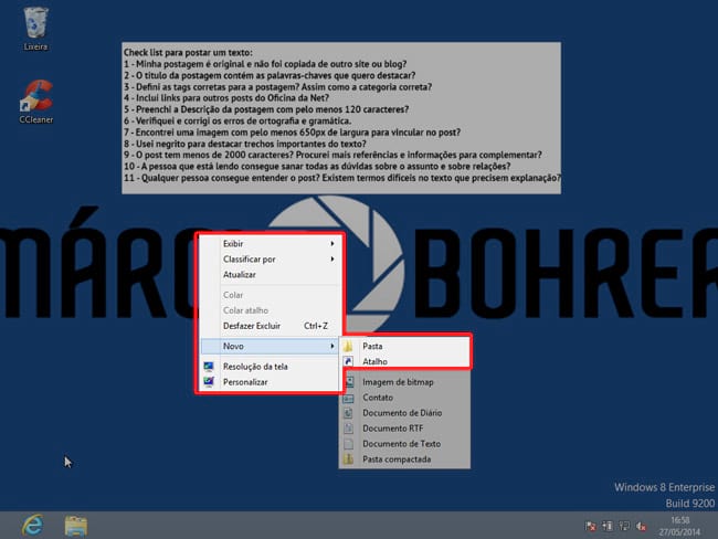 Muito bem. Agora é a hora da verdade. Clique com o botão direito do mouse sobre a área de trabalho, e em seguida em Novo > Atalho.