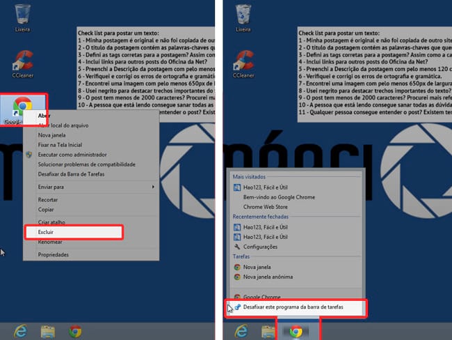 Beleza. Agora vamos detalhar os passos que você deve fazer para se ver livre destas pragas. Vá para a área de trabalho do computador, exclua o atalho do navegador que você utiliza, seja o Chrome - como é meu caso -, seja do Firefox, etc.