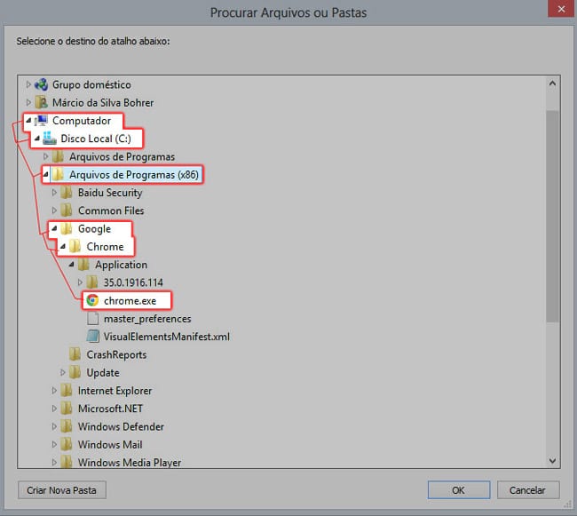 Uma janela se abrirá. Nela você precisa encontrar o caminho de origem dos navegadores que você utiliza. Aqui é o seguinte: Computador > Disco Local > Arquivos e Programas (x86) > Google > Chrome> Application > Chrome.exe.