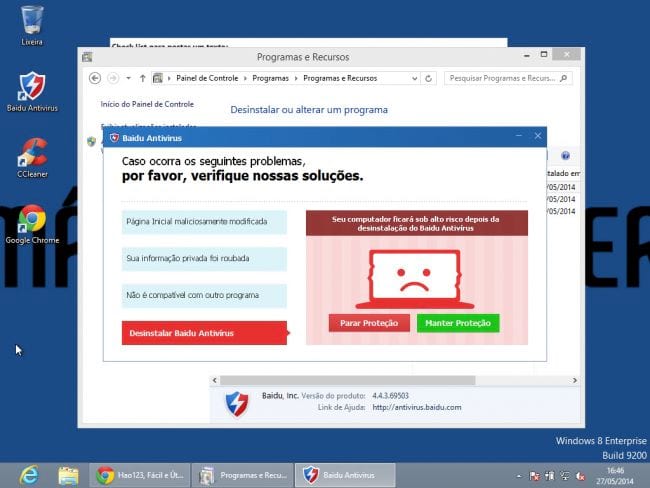 Vou remover também o Baidu Antivirus. Para isto, faça o mesmo procedimento.